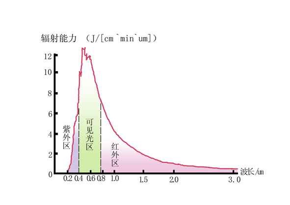 太陽光的極為寬闊的連續譜以及數以萬計的吸收線和發射線,是一個極為豐富的太陽信息寶藏。太陽光譜屬于G2V光譜型,有效溫度為5770 K。太陽電磁輻射中99.9% 的能量集中在紅外區、可見光區和紫外區。在地面上觀測的太陽輻射的波段范圍大約為0.295~2.5um。短于0.295um和大于2.5um波長的太陽輻射,因地球大氣中臭氧、水氣和其他大氣分子的強烈吸收,不能到達地面。